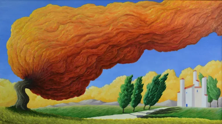 El árbol es el tema preferido del autor, como un objeto sagrado portador de energía. Una visión onírica de una fortaleza enfrentada a la naturaleza