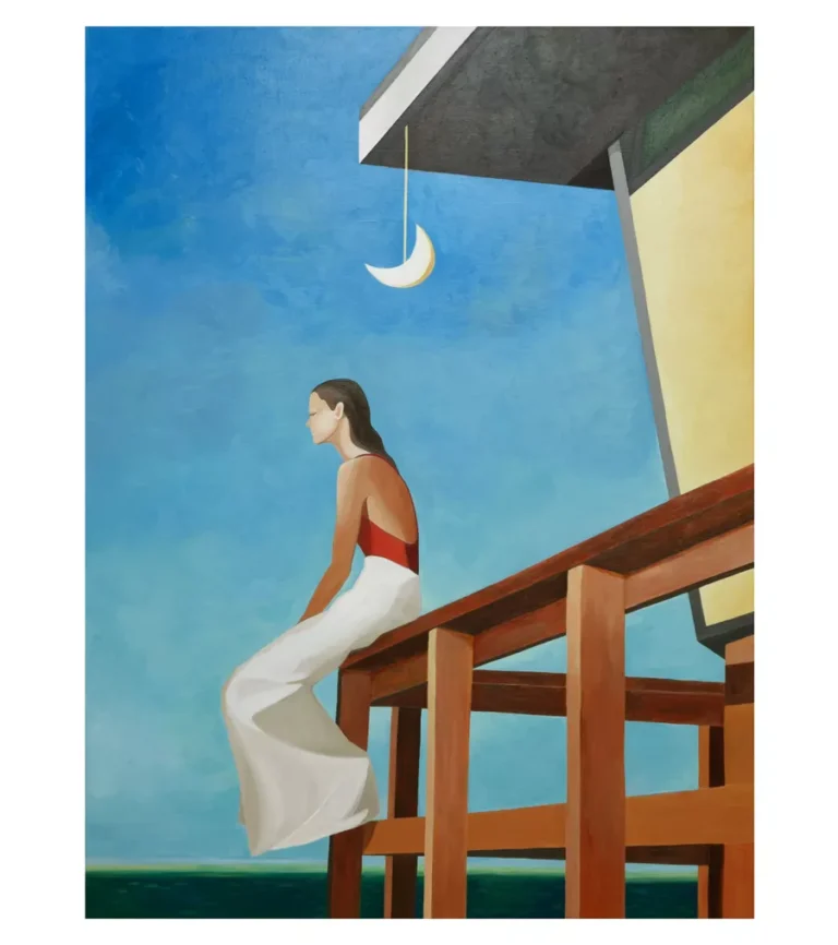Captura un momento que hace imaginar una historia, como la escena de una película. La luna colgada, la mujer ensimismada, una luz que no escdel