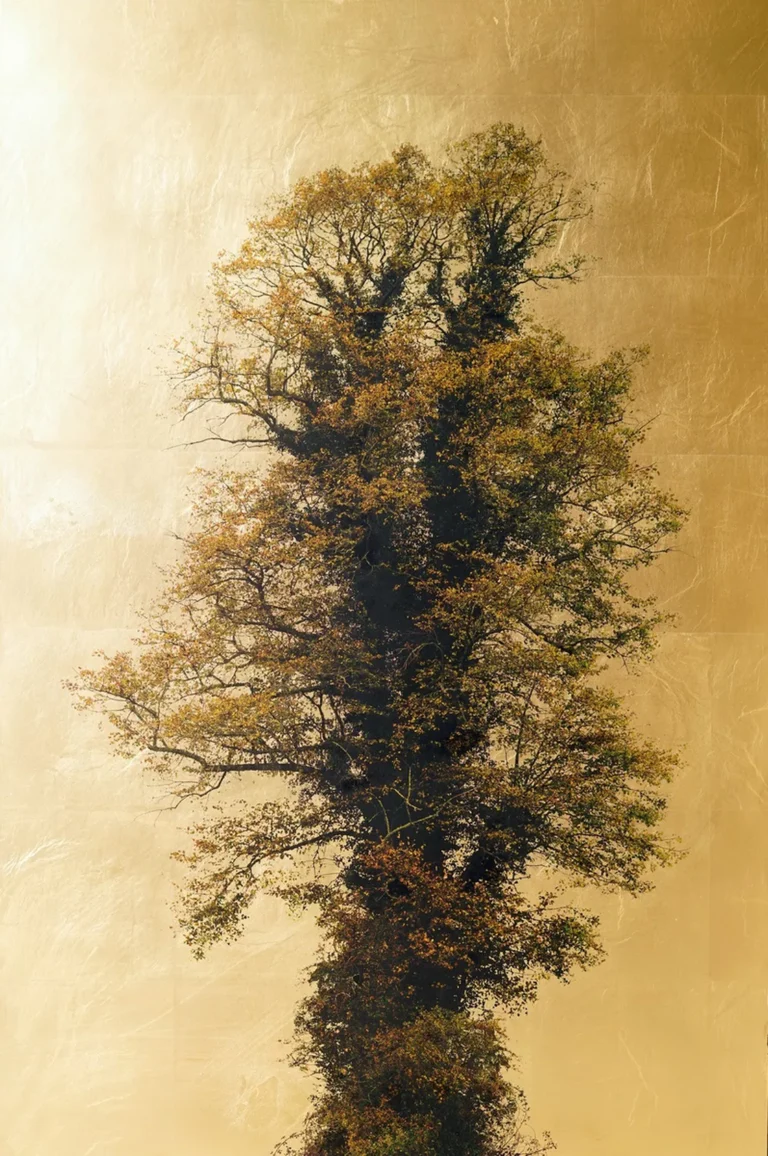 Creado mediante la aplicación de veladuras, tintas pigmentadas fotográficas y pintado sobre aluminio dorado. El pan de oro produce reflejos que varían con la luz