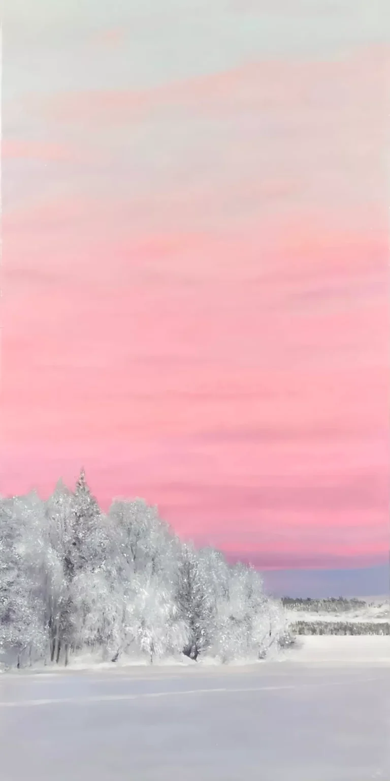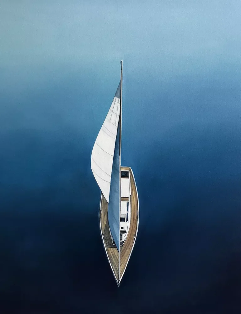La obra se presenta como una mirada aérea, casi fotográfica, que transmite una sensación inmediata de calma y silencio. La pincelada lisa y contenida trabaja