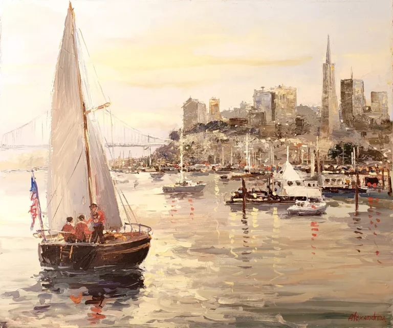 La pincelada y la luz, de estilo impresionista, reflejan el espíritu de alegría y libertad de un puerto mediterráneo. El brillo del agua, las gaviotas,